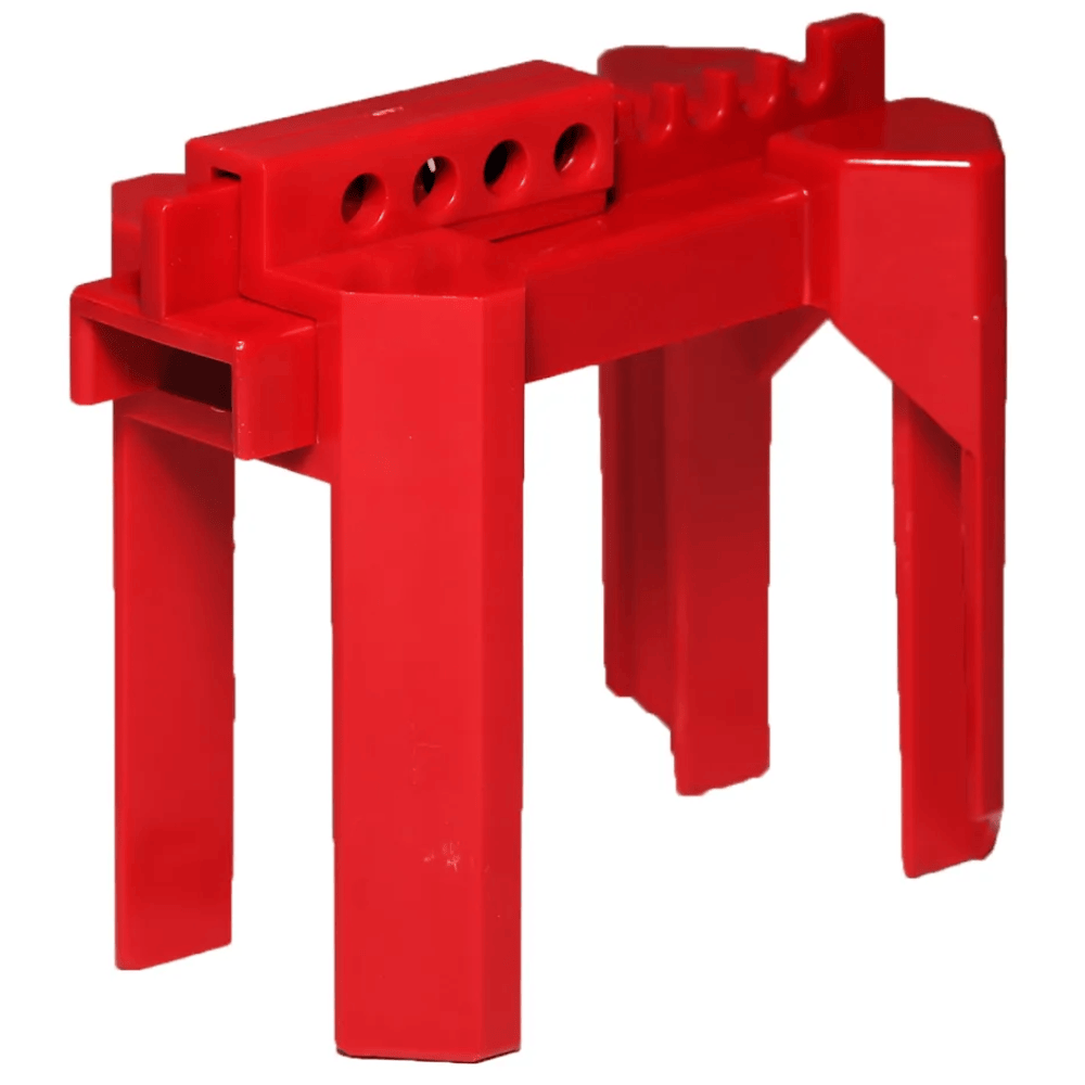 Dispositivo de Bloqueio de Válvula Esfera ajustável, composto por duas partes, tamanho pequeno, confeccionado em plástico ABS na cor vermelha. Trava válvulas e tubulações de 1/2″ a 2 1/2″ na posição fechada e de 1/2″ a 1 1/2″ na posição aberta.