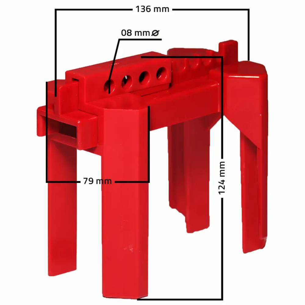 O bloqueio de válvula registro e globo é feito em plástico polipropileno na cor vermelha.