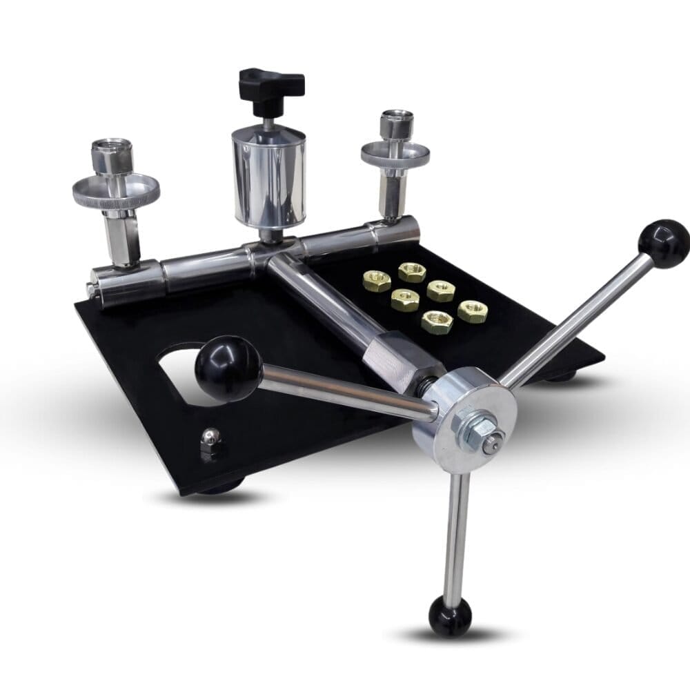 Bomba Hidráulica Portátil para Calibração de Manômetro especialmente projetada para serviços de campo. Sistema de Comparação ao padrão, construído em aço inox, fuso em aço inox. volante em alumínio fundido, base de alumínio para uso em bancada.