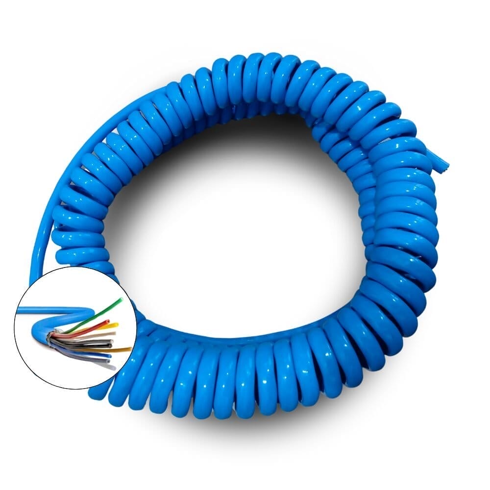 Cabo espiralado com seis condutores, equipado com pontas lisas, ideal para conexões que exigem flexibilidade, extensão e retração automática de até 9 metros. Seu projeto transmite sinais ou energia de forma confiável em ambientes industriais, linhas automáticas ou painéis móveis, mantendo organização e evitando emaranhados.