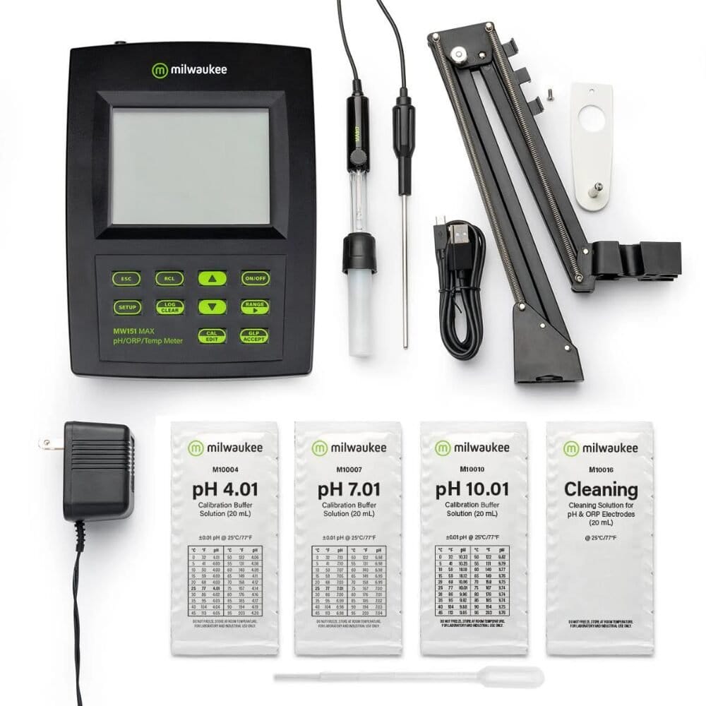 O Milwaukee MW180 MAX é um medidor de bancada preciso e versátil que combina pH/ORP/EC/TDS/NaCl/Temperatura em um único equipamento. Com calibração fácil de 1 ponto para EC/NaCl e até 3 pontos para pH, oferece precisão de ±1% para EC/TDS/NaCl e até ±0,002 pH, com compensação automática de temperatura (ATC) e design resistente para uso profissional.