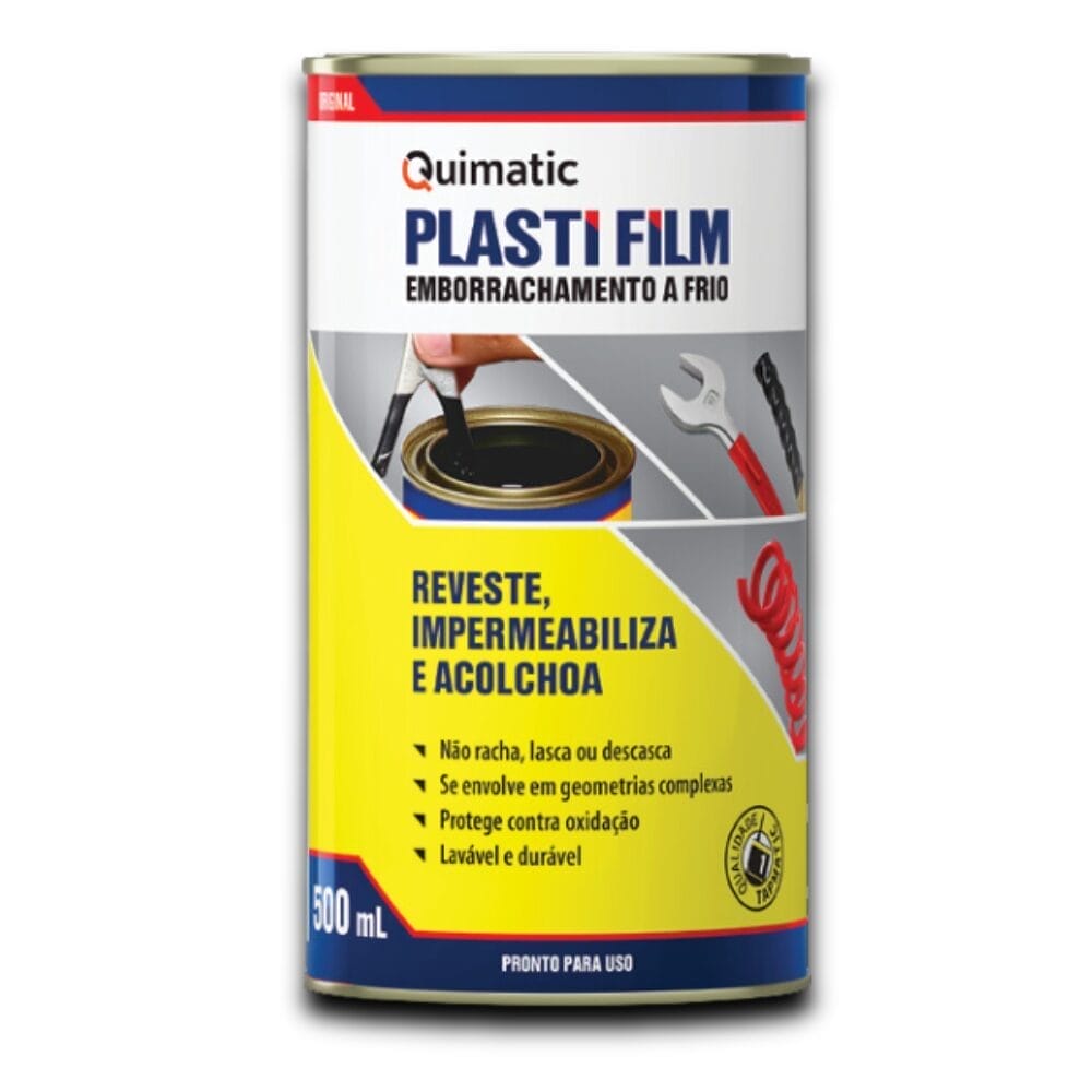 O Emborrachamento a Frio Plasti Film é um produto versátil de 500ml que reveste, impermeabiliza e acolchoa diversas superfícies. Ideal para emborrachamento de cabos de ferramentas, terminais de cordas, lacres e diversos acessórios, oferece alta elasticidade, resistência a ácidos e água do mar, proteção contra ferrugem e superfície lisa lavável. Pode ser aplicado por imersão ou pincel.